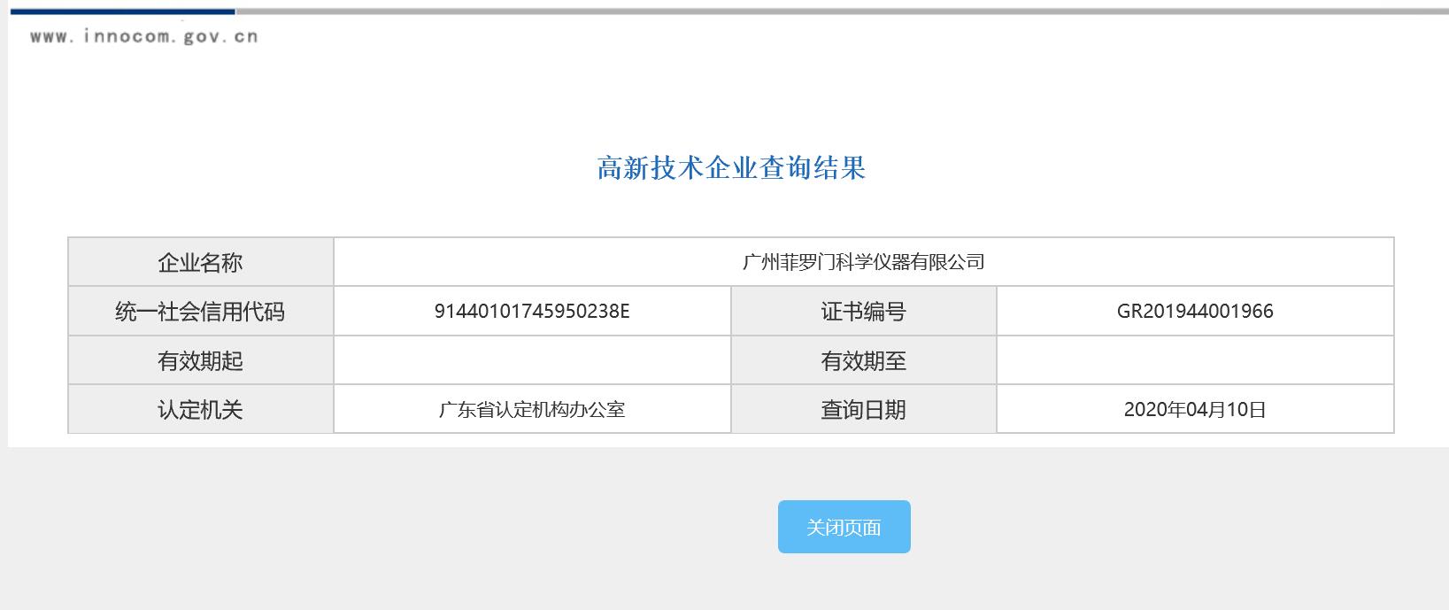 根據(jù)國(guó)家《高新技術(shù)企業(yè)認(rèn)定管理辦法》和《高新技術(shù)企業(yè)認(rèn)定管理工作指引》的相關(guān)規(guī)定,廣州菲羅門科學(xué)儀器有限公司被認(rèn)定為國(guó)家級(jí)高新技術(shù)企業(yè)。 菲羅門高新企業(yè)證書編號(hào):GR201944001966