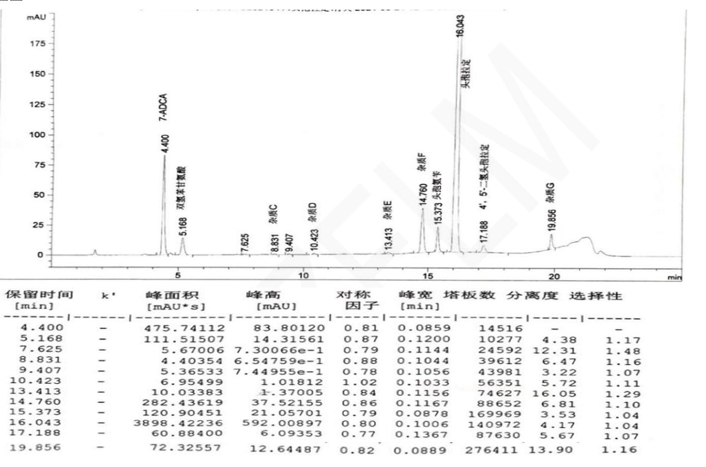 客戶評價(jià):頭孢拉定的保留時(shí)間約為 15min,7-氨基去乙酰氧基頭孢烷酸、雙氫苯甘氨酸、雜質(zhì) C、雜質(zhì) D、雜質(zhì) E、雜質(zhì) F、頭孢氨芐、4',5'-二氫頭孢拉定和雜質(zhì) G 依次出峰,頭孢拉定和頭孢氨芐的分離度應(yīng)不 小于 4. 0,其他各組分峰間分離度符合規(guī)定。