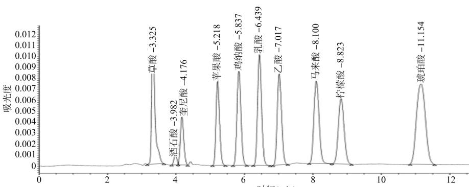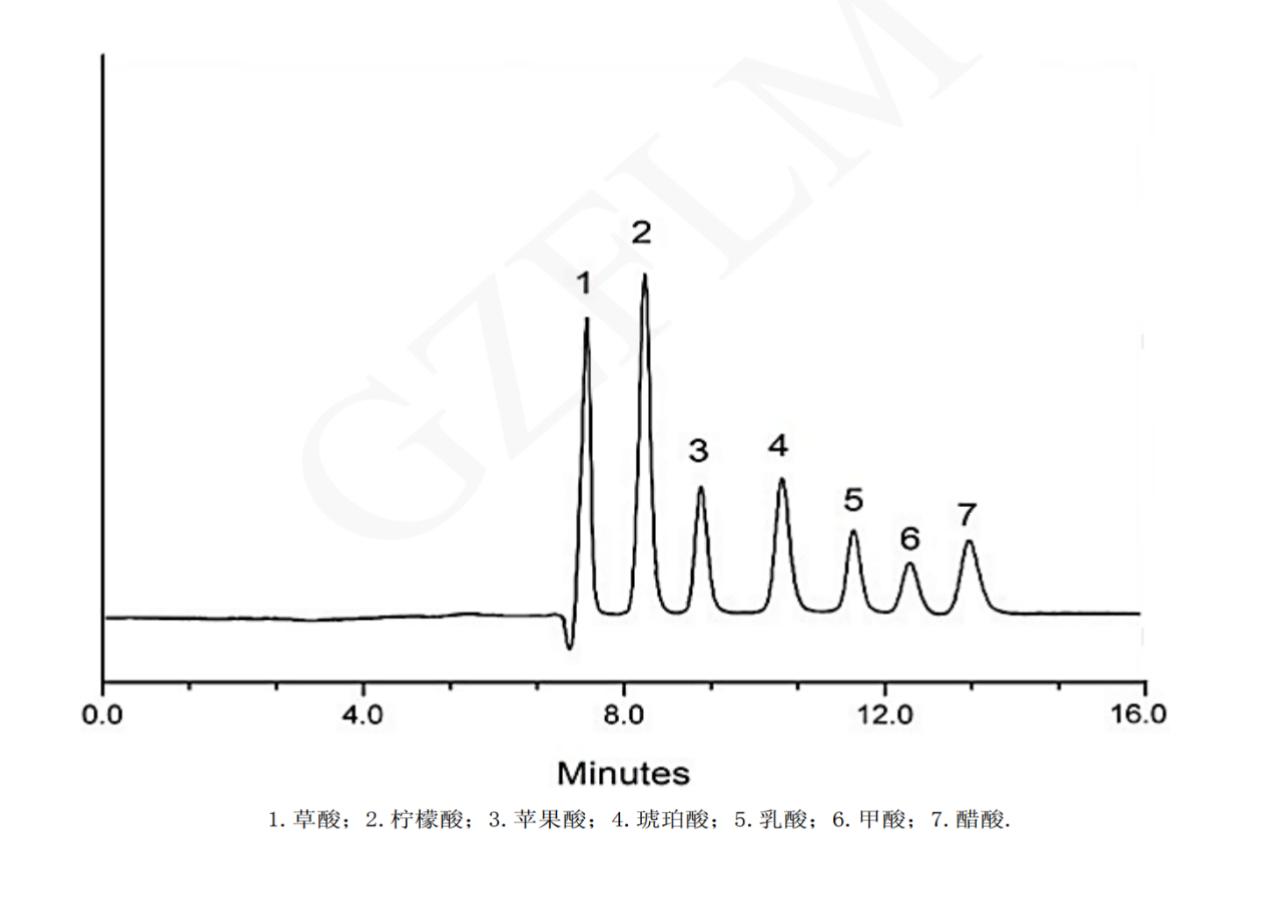 色譜柱:Mars MOA 10μm 300×7.8mm(貨號(hào):FMH-1138-KONU) 流動(dòng)相:2.5mM H2SO4 流速:0.6ml/min 進(jìn)樣體積:10μL 檢測: RID 柱溫:80℃
