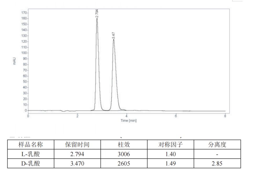 三,乳酸的手性分析方法(HPLC+UV) 流動(dòng)相:2mM CuSO4水溶液:異丙醇=95:5 流速:1mL/min 波長:254 溫度:25C° 進(jìn)樣量:1uL 色譜柱1:Chiral AAOA 3u 50*4.6mm(貨號(hào):FMB-AAOA3-EONU)快速分析