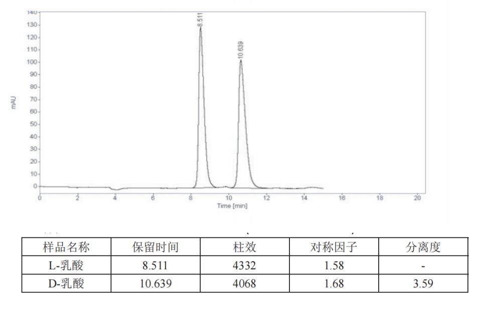 色譜柱2的方法也完全符合國家以下標(biāo)準(zhǔn): A.GB1886.173-2016關(guān)于食品添加劑乳酸D,L異構(gòu)體的檢測用柱要求 B.GB25555-2010 關(guān)于食品添加劑乳酸鈣的D,L異構(gòu)體的檢測用柱要求