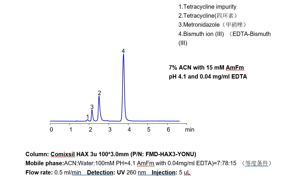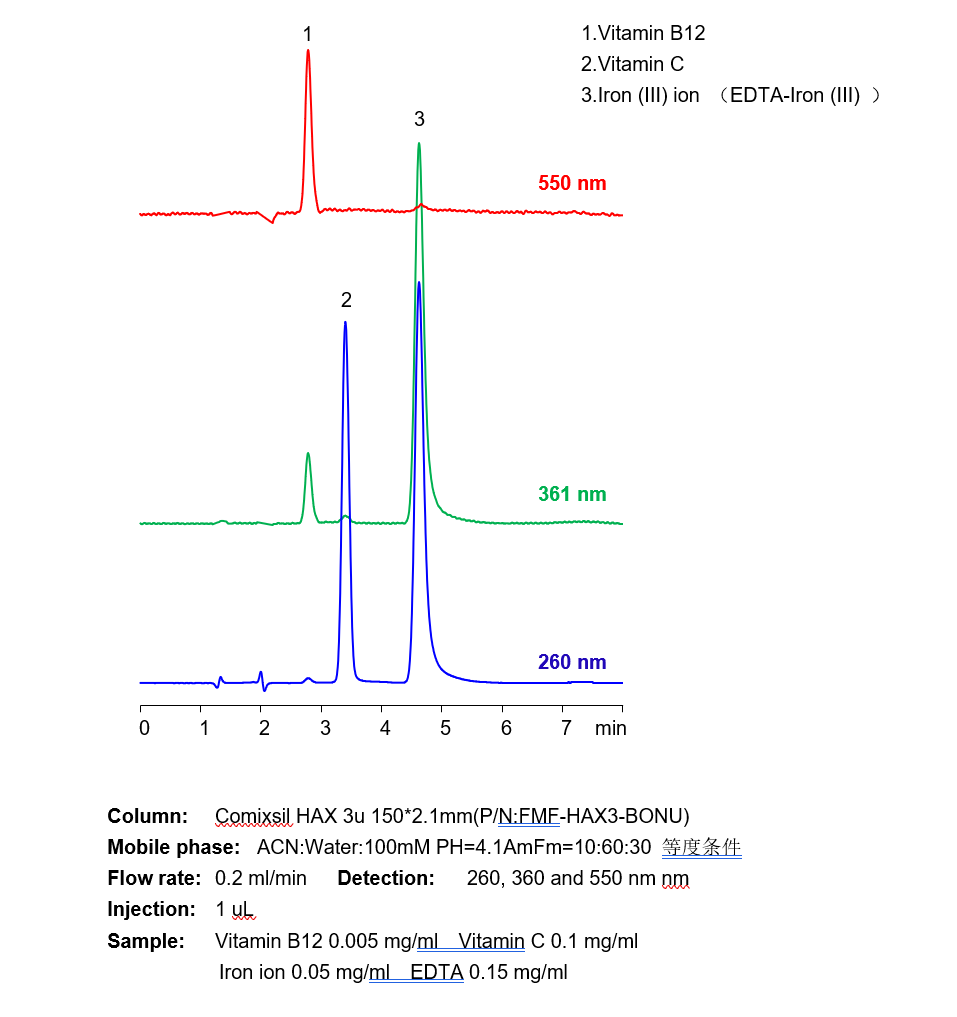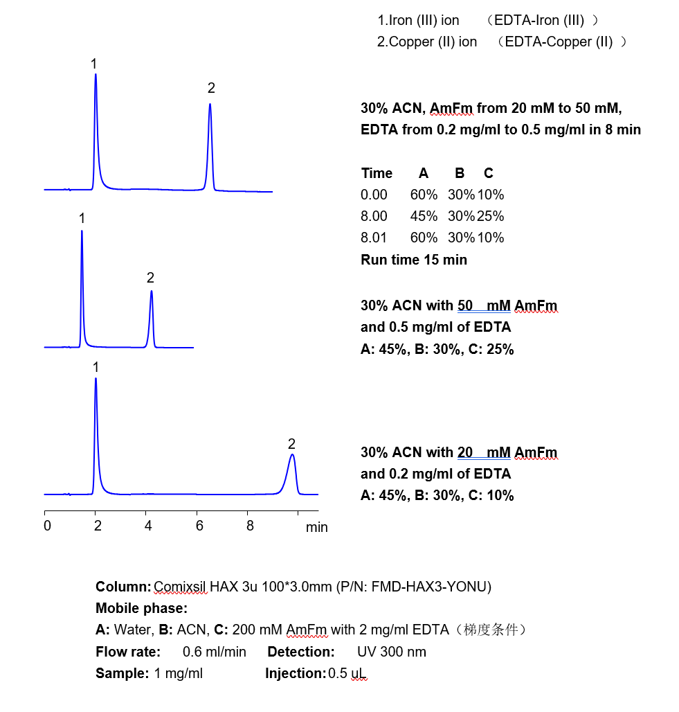 三價鐵離子等三價金屬離子,在硅膠基質(zhì)的色譜柱中極易死吸附,從而損壞色譜柱,在液相直接檢測中存在較大難度。 本方法研究三價鐵離子與EDTA形成紫外可見的強吸收絡(luò)合物,再通過Comixsil HAX色譜柱保留。通過對絡(luò)合物的定量從而定量三價鐵離子等三價金屬離子。 應(yīng)用一:三價鐵離子的檢測 方法A、三價鐵離子流動相中與EDTA絡(luò)合