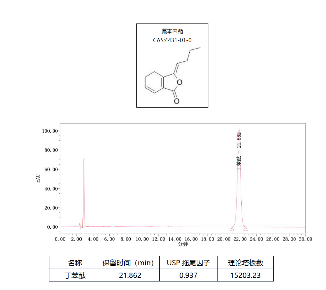 App ID: FLM-T250008 Titank C18-Plus 對川芎中藁本內(nèi)酯含量測定 方法:中國藥典2025 一部 色譜柱:Titank C18-plus 5μ 250×4.6mm (貨號:FMG-0060-EONU) 流動相:甲醇:水=52 : 48 流速:1mL/min 檢測:丁苯酞UV 230nm 藁本內(nèi)酯UV 330nm 溫度:35℃ 樣品濃度:8mg/mL(藥典規(guī)定) 進樣量:10uL 標準品色譜圖:丁苯酞230nm
