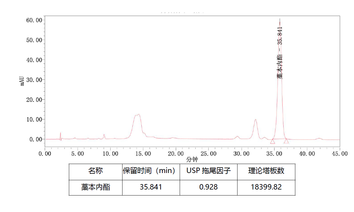 評價:藥典要求丁苯酞峰理論塔板數(shù)高于3000,藁本內(nèi)酯色譜峰與丁苯酞色譜峰相對保留時間1.67 ± 5% ( 34.69min-38.34min ) , 以上要求非常挑柱。經(jīng)多柱篩選, 采用Titank C18-Plus 5u 250*4.6mm 色譜柱,藁本內(nèi)酯出峰35.84,符合要求,且理論塔板數(shù)遠高于藥典要求。 |